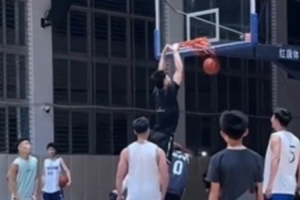 再扣一个!杨瀚森接队友好传球 篮下高举高打双手轻扣!