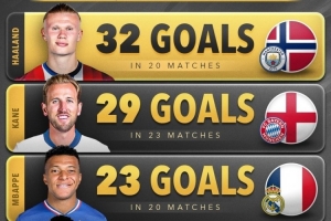 体育资讯11月17日讯 Score90统计了本赛季五大联赛球员俱乐部+国家队的进球数量,并列出榜单,哈兰德32球居首,凯恩、姆巴佩二三位。